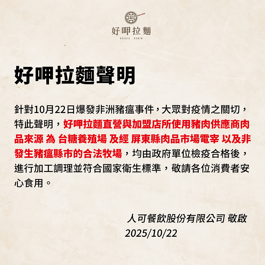 針對10月22日爆發非洲豬瘟事件,大眾對疫情之關切,特此聲明,好呷拉麵直營與加盟店所使用豬肉供應商肉品來源 為 台糖養殖場 及經 屏東縣肉品市場電宰 以及非發生豬瘟縣市的合法牧場,均由政府單位檢疫合格後,進行加工調理並符合國家衛生標準,敬請各位消費者安心食用。