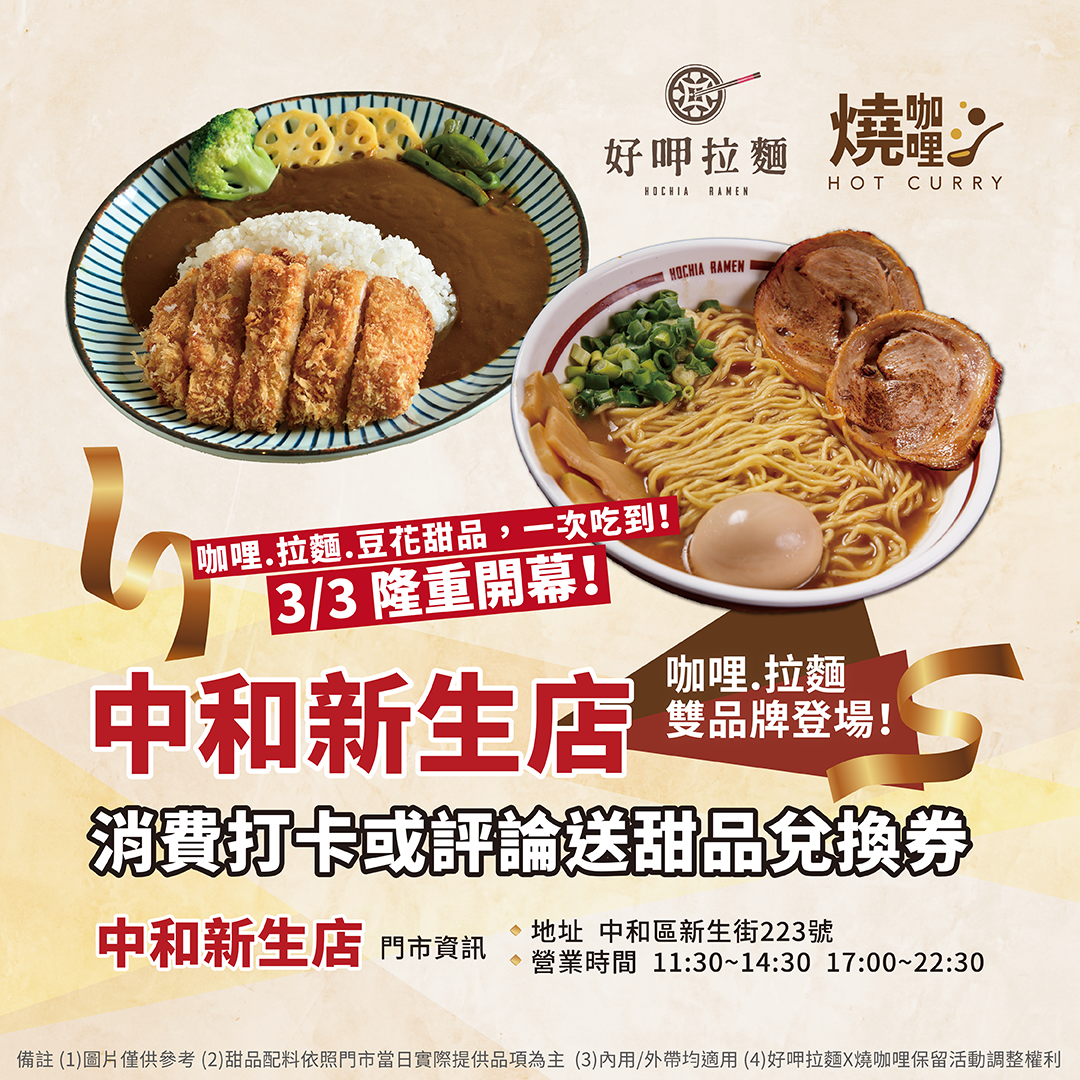 【好呷拉麵 ✕ 燒咖哩】雙品牌門市,正式插旗中和囉!一次滿足你想吃香濃拉麵與誘人燒咖哩的慾望,雙重美味、一次到位!